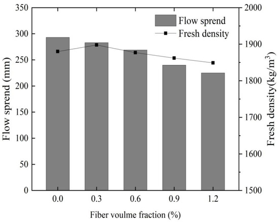 The study reveals that an excessive fiber content significantly reduces the fluidity of fresh cement, leading to poor dispersion of fibers and potentially leading to a deteriorated fiber reinforcement effect. Accordingly, it is imperative to examine the fluidity of fiber-reinforced cement in its fresh state [60]. Figure 7 illustrates the impact of glass fiber content on the workability and apparent density of MgO-SiO2-H2O cement. Notably, compared to the glass fiber-reinforced cement, magnesium silicate hydrate cement devoid of glass fibers exhibits superior fluidity. As the fiber content increases, the flow spread diameter of the mortar gradually diminishes from 290 mm. At a glass fiber content of 1.2%, the fluidity deteriorates to its lowest level with a minimum flow spread diameter of 228 mm, representing a 21.3% reduction compared to the reference group. Furthermore, the decrease in spread diameter becomes more pronounced with an increase in fiber content. These findings indicate that the incorporation of glass fibers adversely affects the fluidity of MgO-SiO2-H2O cement. The primary cause of this reduced fluidity can likely be attributed to the random and uniform distribution of glass fibers in the MgO-SiO2-H2O system, which forms a network structure acting as a “skeleton” within the cement matrix. Consequently, the movement of the cement slurry within the network structure is restricted, resulting in heightened friction and shear forces between the components of the mixture. These factors impede the free flow of the mixture and, consequently, negatively impact the fluidity of the mortar [61].