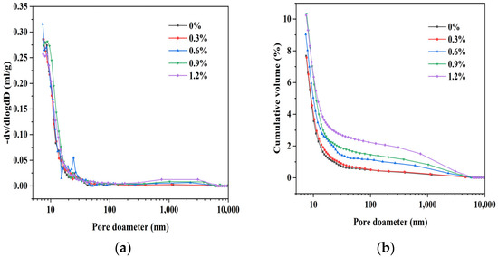 Pore size distribution of M-S-H with 0–1.2% glass fiber content. (a) Pore size distribution and (b) cumulative pore volume.