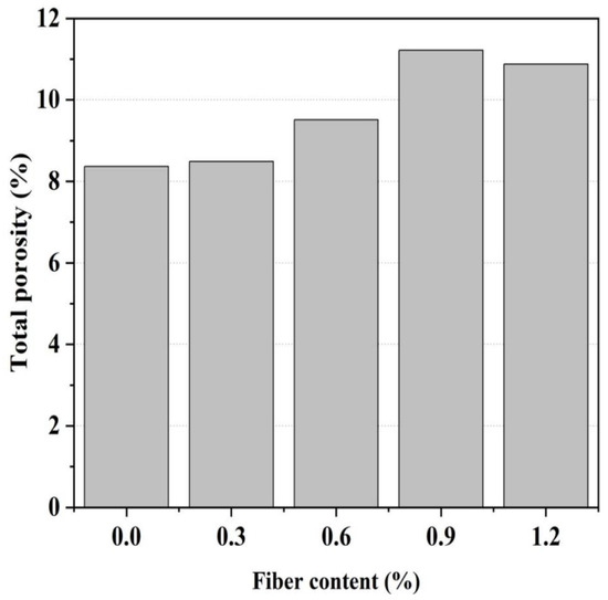 Figure 8 illustrates the pore structure characteristics of glass fiber-reinforced magnesium silicate hydrate cement-based composites, which indicate the principal pore size distribution in the MgO-SiO2-H2O system is in the range of 10–100 nm, and the inclusion of glass fibers does not significantly alter the pore size distribution in the cement mortar. The porosity of 28 d glass fiber-reinforced magnesium silicate hydrate cement composites with different fiber dosages (Figure 9) shows that the control group without any fiber content has the lowest porosity of 8.47%, while specimens with a 1.2% fiber content have the highest porosity of 10.88%. This result suggests that, as the fiber content increases, the porosity of the specimens slightly increases, which could be attributed to the thicker interfacial layer between the fiber and the cement matrix [43,44]. Despite the slight increase in porosity resulting from the addition of fibers, the glass fiber-reinforced magnesium silicate hydrate cement specimens demonstrate superior mechanical performance compared to conventional mortar, which is mainly due to the strong bonding force and lateral confinement between the fibers and the cement matrix [45]. Research has shown that the introduction of fibers to the cement matrix produces two primary effects: an increase in porosity and an enhancement of crack propagation resistance. If the increase in porosity outweighs the resistance to crack propagation, the strength of the composite material diminishes, and vice versa [46,47,48]. According to the results of this study, the addition of glass fibers enhances the strength of the composite material, indicating that the dominant effect is the resistance to crack propagation rather than the influence of porosity.