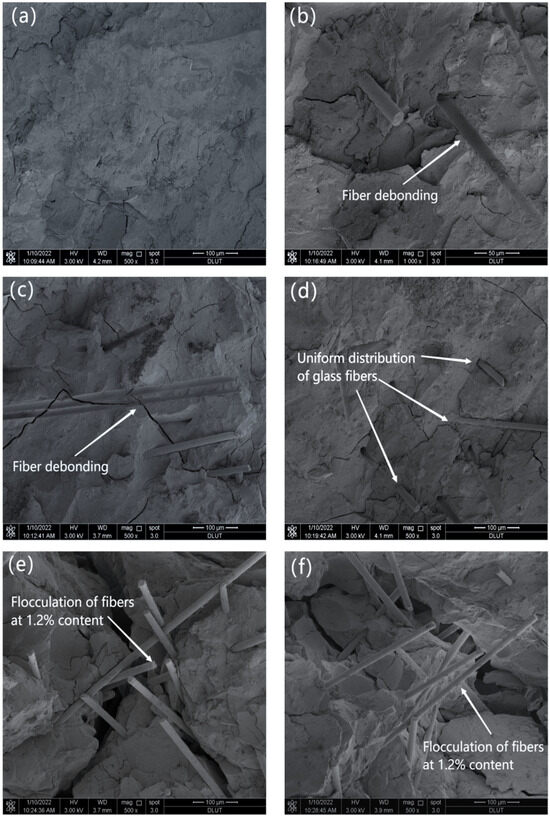 Micromorphology of specimens under different fiber content: (a) 0%, (b) 0.3%, (c) 0.6%, (d) 0.9%, (e,f) 1.2%.