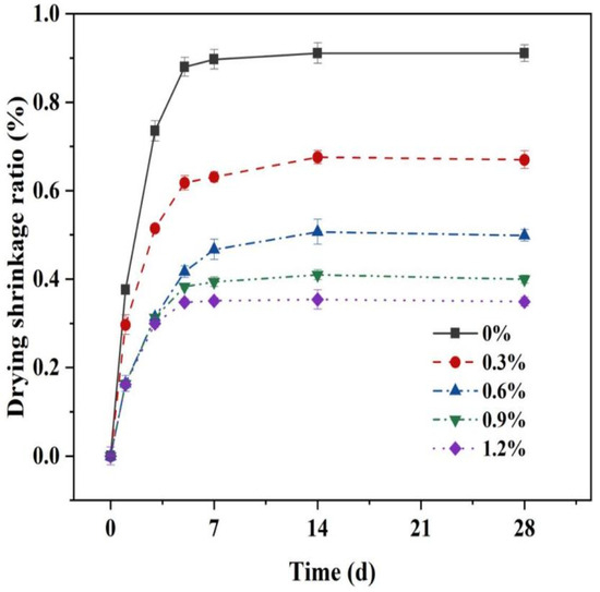Based on the data shown in Figure 13, it is evident that the drying shrinkage curve of the test specimen exhibits two distinct stages. Initially, the drying shrinkage deformations develop rapidly before 7 days, at which point the drying shrinkage value accounts for more than 90% of the total shrinkage value; subsequently, the drying shrinkage stabilizes during the later stages. This is because the MgO-SiO2-H2O system has weaker water retention compared to ordinary Portland cement [54]. Under drying conditions, the internal relative humidity of the MgO-SiO2-H2O system decreases rapidly, leading to significant drying shrinkage. However, the introduction of glass fibers effectively reduces the drying shrinkage of the MgO-SiO2-H2O system. As the percentage of glass fibers increases (0.3%, 0.6%, 0.9%, and 1.2%), the drying shrinkage of the cement diminishes by 26.45%, 45.22%, 56.10%, and 61.70%, respectively.