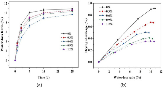 Figure 12 demonstrates the variation in the shrinkage of MgO-SiO2-H2O cement with different glass fiber contents under sealed conditions. The shrinkage rate under sealed conditions initially increases rapidly with the age of the curing period, and then the rate of shrinkage slows down after 28 days, but there is still a trend of continued shrinkage at 28 d. The addition of glass fibers effectively transmits capillary pressure, thereby reducing the shrinkage of the system. As a result, at the age of 28 d, specimens with fiber contents of 0.3%, 0.6%, 0.9%, and 1.2% exhibit shrinkage reductions of 11.5%, 30.4%, 36.1%, and 32.2%, respectively, compared to the control group. The self-desiccation shrinkage of specimens occurs under sealed conditions without any moisture exchange with the external environment, while maintaining a constant temperature. The primary cause of shrinkage is the high reactivity of MgO, which leads to rapid early hydration and increased water consumption, gradually reducing the internal relative humidity [62]. However, when glass fibers are added during the mixing process, they adsorb a small amount of free water on their surface and between individual fibers. As cement continues to hydrate, the pore structure gradually becomes finer, resulting in a decrease in internal humidity. At this point, the fibers release the absorbed water, slowing down the decline in internal relative humidity and restraining shrinkage under sealed conditions. In summary, experimental results indicate that the addition of fibers effectively reduces the shrinkage of magnesia–silica cement mortar under sealed conditions while enhancing its mechanical properties.