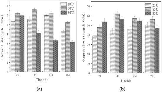Figure 2 illustrates the impact of glass fiber content on the flexural strength of the MgO-SiO2-H2O system. Figure 2a illustrates that the flexural strength of MgO-SiO2-H2O cement increases as the curing time increases, indicating the hydration process of cement-based composite materials. Figure 2b shows that the early-age flexural strength (7 d) of cement-based composite materials has a relatively slow growth rate, whereas the strength growth rate in the later stage (14–28 d) improves. This phenomenon is associated with the hydration process of MgO-SiO2-H2O. During the early stage of cement hydration, the main reaction is the formation of Mg(OH)2 from MgO. Although some M-S-H gel is also formed, its content is relatively low, thus making a minimal contribution to the development of strength in cementitious materials. As hydration proceeds, the amount of M-S-H gel increases, becoming the primary contributor to the strength of MgO-SiO2-H2O. Hence, the rate of flexural strength increase in the later stage is higher.