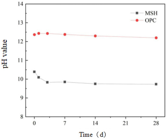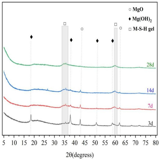 To investigate the hydration products of magnesium silicate hydrate cement under water-curing conditions at a temperature of 50 °C, X-ray diffraction (XRD) was used to characterize the hydration products at different stages of accelerated aging, as shown in Figure 17. The characteristic peaks of Mg(OH)2 are noticeable at 2θ = 18.6°, 38.0°, and 50.8°, and it is evident that the intensity of these peaks gradually diminishes with increasing curing age, which reveals that Mg(OH)2 is an intermediate product in the MgO-SiO2-H2O system and reacts with silicate ions during the later stages of the reaction, thereby forming M-S-H gel. The diffuse peaks of M-S-H gels are apparent at 2θ = 32–38° and 58–62° and become more pronounced as the curing age increases. Based on the XRD results, the accelerated aging experiment accelerates the hydration reaction, and throughout the long-term aging process, the types of hydration products of the MgO-SiO2-H2O system remain unchanged, with Mg(OH)2 and M-S-H gels as the main hydration products. Previous research [67] indicates that completely hydrated ordinary Portland cement (OPC) produces a substantial amount of Ca(OH)2 over its service life, thus maintaining a highly alkaline environment. The absence of Ca(OH)2 in the hydration products is the fundamental reason that the pH of the magnesium silicate hydrate cement system is lower than that of Portland cement, which also suggests that the MgO-SiO2-H2O system does not corrode glass fibers in the long term.