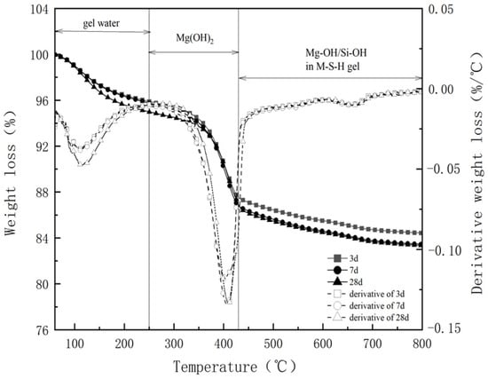 The hydration process of MgO-SiO2-H2O under 50 °C conditions was characterized using TGA testing, as depicted in Figure 18. This weight loss process can be divided into three stages within the MgO-SiO2-H2O system. The first stage, occurring between 50 °C and 250 °C, entails the removal of free water and physically adsorbed water from gel pores [68]. The second stage, between 250 °C and 430 °C, corresponds to the dehydroxylation process of Mg(OH)2 [69], which serves as an intermediate product in the hydration process of MgO-SiO2-H2O. During this stage, MgO undergoes initial hydration to form Mg(OH)2, followed by its reaction with SiO2 to form the M-S-H gel [70]. The third stage, between 430 °C and 800 °C, involves the removal of Mg-OH and Si-OH from the gel structure. Figure 18 indicates that changes in the hydration process under 50 °C conditions are not particularly noticeable with increasing aging. However, higher curing temperatures expedite the hydration process, and no new hydration products are observed throughout the entirety of the process. In summary, throughout the accelerated aging process, the M-S-H system consistently maintains a low alkalinity level, thereby ensuring the long-term presence of glass fibers in the cementitious materials.