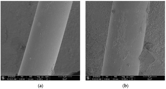 5. A scanning electron microscope (SEM) was employed to analyze the microscopic morphology of the samples, which effectively characterized the dispersion degree, binding state, and microstructure of glass fibers in the matrix. The equipment used was the Nova Nano SEM-50, manufactured by FEI Company in Hillsboro, OR, USA. The specific working parameters of the instrument were as follows: an operating voltage of 230 V, an operating current of 8 A, a scanning frequency of 50/60 Hz, and a resolution of 1.5 nm and 1.0 nm in high and low vacuum modes, respectively.