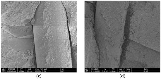 From Figure 11a,b, it can be observed that the cement hydration products are bonded to the surface of the fibers, indicating a great chemical bond between the glass fibers and the MgO-SiO2-H2O cement. This bond enhances the friction resistance during fiber pullout, thereby improving the mechanical properties of the magnesium silicate cement [53]. The results suggest that the reinforcement effect of glass fibers on cement-based composites can be attributed to two main factors. One is that the glass fibers demonstrate good chemical compatibility with the cementitious materials. When glass fibers are added to cement-based composites, they tightly bond with the cement matrix, disrupting the original stress distribution and limiting crack formation. The other is that when cracks form, the glass fibers, as they traverse through the cracks, are capable of withstanding stress and act as bridges within the matrix, effectively preventing crack propagation.