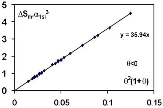 (Smαls3) is effectively proportional to (1 + θ) θ2 with (θ) being the reduced temperature of undercooling of 38 liquid elements, obtained after overheating the melt, using volumes v and time t with vt = 10−8 ± 1 m3s, Kv = 90, Ln (Kvvt) = 71.9 ± 1 in agreement with the predictions of Equation (6), as shown in Figure 1 [4].