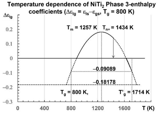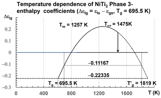 The temperature T′g = 1714 K is equal to (2 Tm − Tg) with Tm = 1257 K and Tg = 800 K. The temperature of 2120 K corresponds to θn+ = 0.68632, being equal to the sum of singular enthalpy coefficients (0.14085 + 0.18178 + 0.36369) of Phase 3 with Tg = 800 K, and determining the highest glass transition temperature of Phase 3 and the highest melting temperature of NiTi2, as already observed for several liquid elements [62].