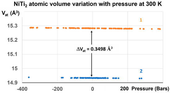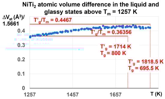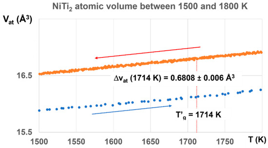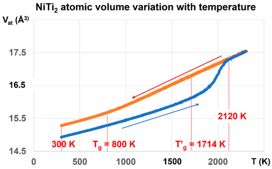 The NiTi2 atomic volume Vat in Angström3, represented by the red line in Figure 4, is obtained by cooling the melt from 3000 K to 300 K, and is equal to 15.2829 Å3 at 300 K.