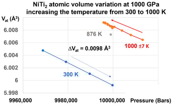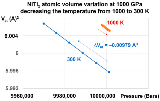 NiTi2 atomic volume variation at 1000 GPa, increasing the temperature from 300 to 1000 K. Increasing the pressure on the glass state at T = 300 K up to 1000 GPa and increasing the temperature from 300 K to 1000 K induces a first-order transition from the glass to the liquid state, and a volume change of +0.00980 Å3, equal to that observed in Figure 5.