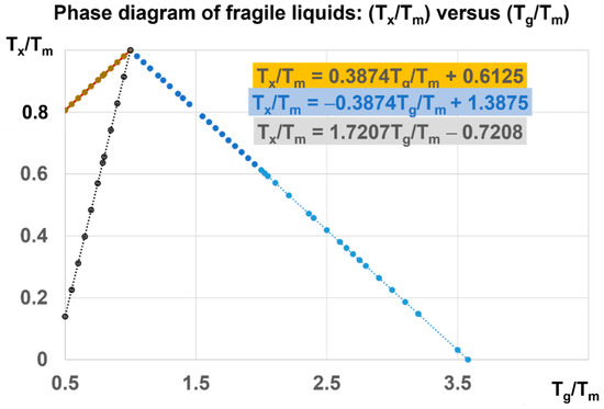 The phase diagram in Figure 7 is devoted to Phase 3 of fragile liquids, having a melting temperature (Tm) and submitted to first-order transitions induced at Tx/Tm and Tg/Tm at various heating rates from their low temperature glass state. The ratio of Tg/Tm of fragile glasses is always higher than 0.5 (θg > −0.5). This limit corresponds to Vogel–Fulcher–Tamann temperatures higher than Tm/3. The reduced glass transition at θg is varying from −0.5 to 2.581 and Tg/Tm from 0.5 to 3.581. For each value of θg, there are first-order transitions of Phase 3, occurring at θx and θn+, accompanied by enthalpy coefficient changes respectively equal to −Δε and +Δε. For example, Tx/Tm = 0.22335 = Δε leads to two glass transitions at T′g/Tm = 0.5487 and 3 (θg = −0.77665 and 2) at zero pressure and constant melting temperature.