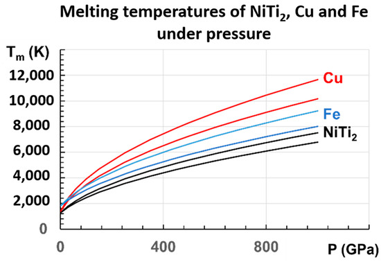 which are represented in Figure 8, together with those of NiTi2 and Fe. For Cu, our extrapolated values in 500 GPa are 7253 K and 8299 K, in agreement with Tm = 7900 K [82]. From another determination in 100 GPa, Tm = 3900 K [86], and our values are 3463 K and 3905 K.