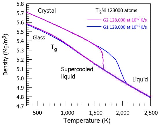 The glass transition of NiTi2 is equal to 800 K with a cooling rate of 1012−1013 K/s and ~700 K [36] for an experimental value obtained on heating [74]. NiTi2 is chosen because its glass transition, at Tg = 800 K, and at high cooling rate, was initially determined by molecular dynamics simulations [36].