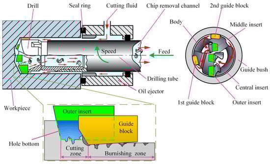The principle of the BTA deep-hole processing system is shown in Figure 1. The cutting inserts of the BTA drill are arranged in a dislocated manner and include the central insert, the middle insert, and the outer insert. The guide blocks are distributed outside of the drill. The BTA deep-hole drilling is completed with the cutting of the workpiece material by the inserts and the secondary burnishing by the guide blocks. The guide blocks are responsible for balancing the tangential and radial resultant force from the cutting inserts, extruding the hole wall from the cutting inserts, completing the self-centering of the machining, and improving the accuracy and surface quality of the hole wall.