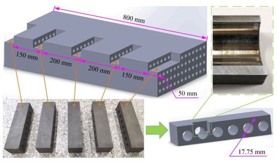 After drilling, the wear status of the BTA drill was observed using the KEYENCE VHX-5000 electron microscope (KEYENCE CO., LTD., Osaka, Japan ), and the morphology of the processed holes was observed using the Olympus IPLEX G Lite endoscope (Olympus (Shenzhen) Industrial Co., Ltd, Shenzhen, China). Furthermore, to study the effect of drilling depth on the quality of the machined holes, the drilled workpiece was cut along the drilling depth direction at hole depths of 50, 200, 400, 600, and 800 mm, respectively; the thickness of the specimen was 50 mm, as shown in Figure 3. The hole diameter, roundness, and perpendicularity of the cut specimens were measured on the Zeiss CONTURA G27 CMM (Carl Zeiss AG, Oberkochen, Germany), and the diamond probe of the CMM was measured within the range of 5 to 45 mm from the specimen. The variation law of deep-hole machining accuracy with the drilling parameters of nuclear power tube plate specimens was attained.