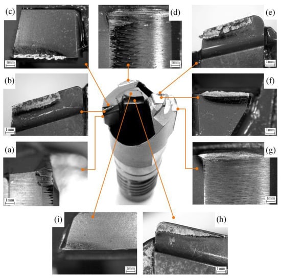 Wear morphology of BTA drill for deep-hole machining: (a) edge sizing blade of outer insert; (b) the rake face of outer insert; (c) the flank of outer insert; (d) the first guide block; (e) the rake face of middle insert; (f) the flank of middle insert; (g) the second guide block; (h) the rake face of central insert; and (i) the flank of central insert.