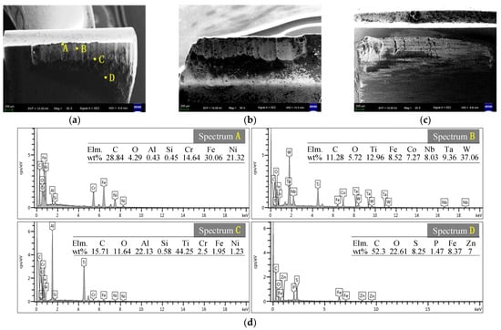 The wear morphology of different areas of a severely worn drill under a scanning electron microscope is shown in Figure 5. When the insert cuts, the temperature increases and the hardness decreases. The hard points in the workpiece material continuously slide against the insert’s cutting edge, forming a striped wear band on the flank of the outer insert, as shown in Figure 5a. The crescent depression on the rake face of the insert can lead to a decrease in the cutting edge strength, which is prone to edge collapse. The strength of the outer insert’s cutting edge area is low, the cutting speed is high, and there is serious boundary wear, as shown in Figure 5b. Due to the high contact stress between the first guide block and the hole wall, fatigue wear and crack formation may occur on the contact surface of the guide block after machining multiple holes, as shown in Figure 5c. An element energy spectrum EDS analysis was conducted on different areas of the flank of the outer insert, and the chemical element distribution and mass percentage of the materials at different positions are shown in Figure 5d.