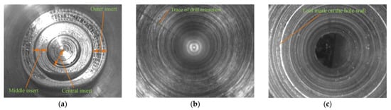 The morphology of the drilled hole wall and bottom observed by the endoscope is exhibited in Figure 6. Figure 6a shows the hole bottom formed by the cutting insert, and the cutting area of the outer insert, middle insert, and central insert as well as the cutting width of each cutting insert along the radial direction can be clearly distinguished. Hole machining involves tool rotation and the axial feed; spiral tool marks are generated on the hole wall. Due to the squeezing effect of the guide blocks, the waviness of the hole wall is relatively small. However, there is a tool retraction mark along the axial direction of the hole wall, as shown in Figure 6b, because the outer insert of the BTA drill has a narrow sizing blade, resulting in scratches being left on the hole wall during the BTA drill retraction. Figure 6c shows the hole wall formed after the tool chatter. The drilling tube rigidity is poor, and the cutting tool system is prone to vibration, resulting in an increase in the radial runout of the BTA drill and an increase in the waviness and roughness of the hole wall.