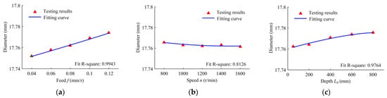 Variation in the drilling hole diameter with the following drilling parameters: (a) the drilling feed range from 0.04 to 0.12 mm/r, when the speed is 1200 r/min and the depth is 50 mm; (b) the drilling speed range from 800 to 1600 r/min, when the feed is 0.08 mm/r and the depth is 50 mm; and (c) the drilled depth range from 50 to 800 mm, when the speed is 1200 r/min and the feed is 0.08 mm/r.