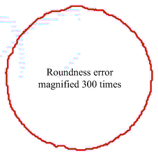 Roundness is an important criterion for evaluating the accuracy of a machined hole. It is the distance between the circumscribed circle and the inscribed circle of the actual profile of the machined hole, and it indicates how close the cross-section of the workpiece is to the theoretical circle. Under the machining process parameters of a speed of 1200 r/min and a feed of 0.08 mm/r, the roundness error of the 50 mm drilling depth was 6.2 μm. When the drilling hole diameter was unchanged, the profile of the roundness error was magnified by 300 times, as revealed in Figure 8.