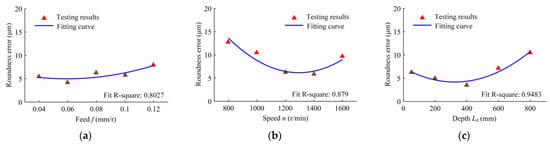 Figure 9 shows the roundness errors of the machined holes for different drilling feeds, speeds, and depths. The effect of the drilling feed on the roundness error is small. With the increase in the feed, the roundness error increases. Compared with the feed, the speed has a greater effect on the roundness error. With the increase in speed, the roundness error first decreases and then increases. With the increase in drilling depth, the roundness error decreases first and then increases. When the feed increases, the drilling force and the force fluctuation increase and the roundness error increases. As a result of the tool system in BTA drilling being a dynamic change process, the roundness is affected by the vibration characteristics of the drilling tool. The drilling speed directly affects the excitation frequency of the deep-hole machining system, and drilling depth affects the natural frequency of the drill, which has an effect on the hole roundness.