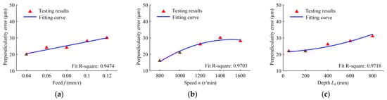 Variation in the hole perpendicularity error with the following drilling parameters: (a) the drilling feed range from 0.04 to 0.12 mm/r, when the speed is 1200 r/min and the depth is 50 mm; (b) the drilling speed range from 800 to 1600 r/min, when the feed is 0.08 mm/r and the depth is 50 mm; and (c) the drilled depth range from 50 to 800 mm, when the speed is 1200 r/min and the feed is 0.08 mm/r.