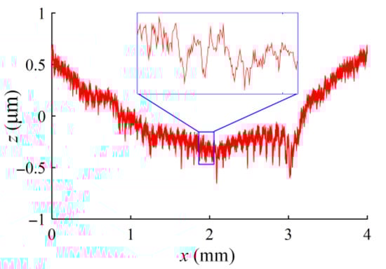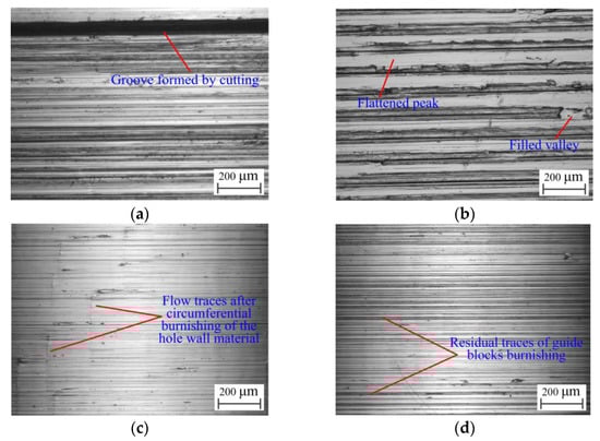 However, if the extrusion deformation of the hole wall is small, the peaks and valleys will not be completely flattened and filled, and the hole wall will still retain the tool marks that are left. The height difference between the peaks and valleys decreases, as shown in Figure 11b. If the extrusion deformation of the hole wall is suitable, the peaks and valleys will be flattened, and the roughness will be the smallest, as shown in Figure 11c. It can also be seen from the residual traces of the material flow that the guide blocks press against the hole wall circumferentially. In addition, if the extrusion deformation of the hole wall is too large, the guide blocks will leave their own traces when burnishing, forming secondary corrugations, as shown in Figure 11d, which increases the hole wall roughness. The surface microstructure curve of the hole wall is shown in Figure 12.