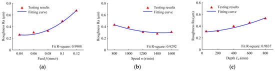 Variation in the hole wall roughness with the following drilling parameters: (a) the drilling feed range from 0.04 to 0.12 mm/r, when the speed is 1200 r/min and the depth is 50 mm; (b) the drilling speed range from 800 to 1600 r/min, when the feed is 0.08 mm/r and the depth is 50 mm; and (c) the drilled depth range from 50 to 800 mm, when the speed is 1200 r/min and the feed is 0.08 mm/r.