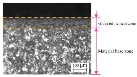 The cutting inserts cause changes in the metallographic structure of the hole wall. Then, during the secondary extrusion of the guide blocks, due to the large contact stress and friction, more heat is generated in the contact area, making the metallographic structure of the hole wall change again. The metallographic structure of the subsurface layer of the hole wall is shown in Figure 14. The subsurface layer of the hole wall has a grain refinement area, and its thickness is larger. The metal crystal structure in this region undergoes grain refinement under the conditions of plastic extrusion deformation and a high temperature to form a dense metamorphic layer with a high level of hardness [34]. The maximum temperature in the deep-hole drilling area of the BTA drill reaches 800 to 1000 °C [19], which exceeds the critical temperature of the phase transition of the metal. At the same time, the drill is in high-pressure cutting oil, and the deformation zone is quenched after the tool leaves, resulting in the higher hardness value of the hole wall.