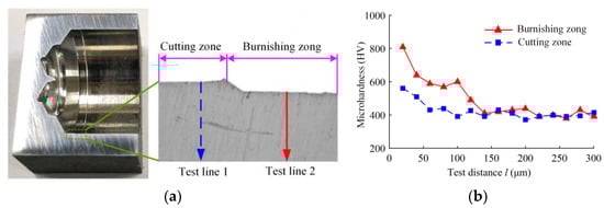 After cutting the specimen with a drilling speed of 1200 r/min, a feed of 0.08 mm/r, and a drilling depth of 50 mm, the Vickers microhardness tester is used to detect the microhardness of the subsurface layer of the hole wall in the cutting area of the inserts and the extrusion area of the guide block at the hole’s bottom. The cutting area of the inserts is sequentially indented and measured along test line 1, while the extrusion area of the guide blocks is sequentially indented and measured along test line 2. The test results are shown in Figure 15. The maximum microhardness of the inserts’ cutting area is 1.37 times the hardness of the matrix material, and the maximum microhardness of the extrusion area is 2.15 times the hardness of the matrix material. The depth of the hardened layer after the extrusion is about 130 μm.