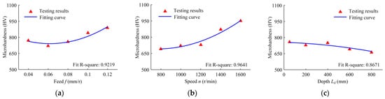 Finally, the surface cut along the diameter of the hole was polished, and 4% nitric acid alcohol solution was used to corrode it. The corrosion time was 3 min. After the corrosion, it was cleaned with anhydrous ethanol, and the metallographic structure of the hole wall subsurface layer was observed. The Wilson Tukon 2500 automatic Vickers hardness tester (WILSON Co., Ltd., Minneapolis, MN, USA) was used to detect the microhardness distribution law in the subsurface layer of the hole wall. To obtain accurate measurement results and prevent damage to the edge area of the hole wall, indentations were made at the subsurface layer 10 μm away from the hole wall, followed by an interval of 20 μm; the total measurement depth was 300 μm. The experimental test results were fitted using quadratic polynomials to obtain their changing trends and to provide the fitting index R-square. The hole wall surface quality and accuracy of the deep-hole machining of the nuclear power tube plate specimen with the drilling parameters were obtained.