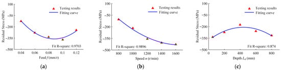 Variation in the hole wall residual stress with the following drilling parameters: (a) the drilling feed range from 0.04 to 0.12 mm/r, when the speed is 1200 r/min and the depth is 50 mm; (b) the drilling speed range from 800 to 1600 r/min, when the feed is 0.08 mm/r and the depth is 50 mm; and (c) the drilled depth range from 50 to 800 mm, when the speed is 1200 r/min and the feed is 0.08 mm/r.