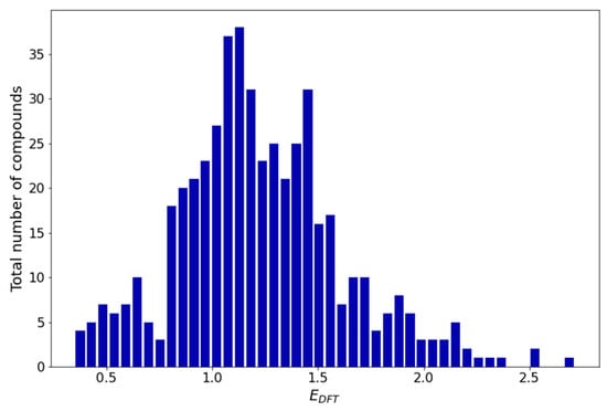 The redox potential distribution (Figure 2) over the entire dataset (494 compounds) shows that the redox potential spans the range of 0.3–2.8 V. The distribution plot has an asymmetric bell-like shape, with the majority of compounds having potentials between 0.75 V and 1.60 V.
