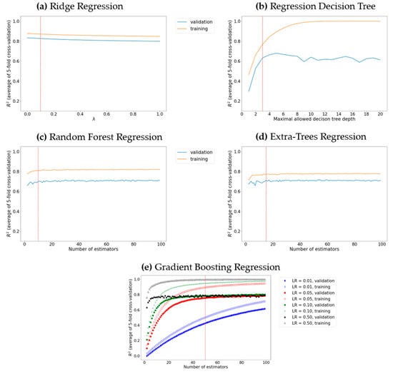 Model tuning via grid search for (a) the optimal learning rate in ridge regression; (b) the optimal maximal decision tree depth; ((c) and (d), respectively) the optimal number of decision tree estimators in random forest regression and extra trees regression; (e) the optimal number of decision tree estimators and the learning rate (LR) in gradient boosting. The optimal hyperparameter value is depicted by a dotted red line.