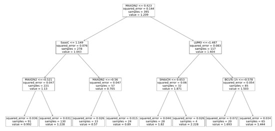It should be noted that, due to their structure of sequential simple tests, decision trees are able to capture nonlinear dependencies between the explanatory variables and the measured property. Decision trees have been successfully utilized to solve both classification and regression problems [54,55,56]. There exist numerous algorithms for decision tree construction: ID3, C4.5, CART, MARS, and CHAID [57]. In the present study, the CART (classification and regression tree) algorithm with a mean square error cost function was used.