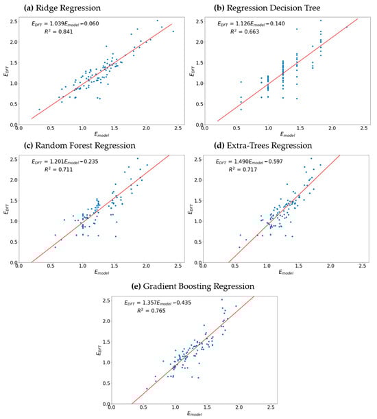 The prediction models’ performance, as evaluated based on the average coefficient of determination over a five-fold cross-validation (R2CV), increases in the following order: regression decision tree (R2CV = 0.632), random forest regression (R2CV = 0.705), extra trees regression (R2CV = 0.715), gradient boosting regression (R2CV = 0.756), and ridge regression (R2CV = 0.832).