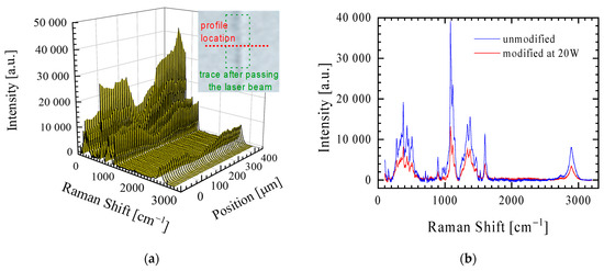 (a) An example of a profile of the Raman spectra of a paper surface made along a line perpendicular to the line of passage of the laser beam (see the image inside the graph with the profile marked as a red dotted line). (b) Raman spectra of the unmodified (profile edge) and modified with a laser with a power of 20 W (profile centre).