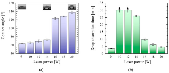 To assess the wettability of the surface, water contact angle measurements were conducted. It can be observed that the contact angle values increased with increasing laser power and exceeded 90° for the surfaces modified with a high laser power (16 W and above) (Figure 4a). Thus, it may be concluded that a laser with a power of at least 16 W must be used for paper modification to obtain a hydrophobic surface. The hydrophobicity of the modified surfaces may have been related to the accumulation of air in the structure of protruding fibres (higher surface complexity). Simultaneously, the water drop absorption time of the paper shortened as the laser power used increased. For lower laser powers (up to 14 W), it was at least 25 min (for 10 and 12 W powers over 30 min, as indicated on the graph with an up arrow), and for laser powers from 16 W, the time was reduced to a few minutes (Figure 4b). This was probably because the spaces between the protruding fibres increased (increased surface complexity) with an increase in the laser power, and thus the water droplets passed through them easier. Additionally, the degradation of paper fillers may progress with an increase in the laser power (as described in Section 3.2), which additionally facilitates passing the water molecules through the modified surface.