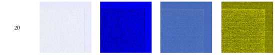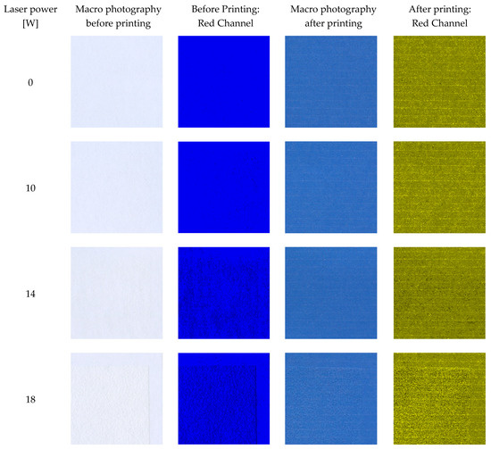 The paper used in the research was designed for office use, especially for photocopying and printing text and high-quality images on inkjet and laser printers. An increased paper stiffness ensures the reliable operation of printing devices. In addition, an optimal level of whiteness ensures an eye-friendly contrast and, at the same time, guarantees a high level of contrast and colour reproduction in printing. The satin structure of the initial paper samples had a smooth surface, which guarantees the quick drying of inkjet prints while maintaining a deep shade of black and uniformly intense colours. To analyse the effect of the laser modification on their printability, the paper samples were printed with inkjet ink. The samples were then scanned and analysed for RGB to determine the non-uniformity of the prints. The obtained results were compared with the unmodified samples and are presented in Figure 5.