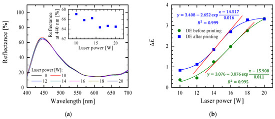 Light reflectance spectra were registered for the samples printed with blue inkjet ink (Figure 7a). A decrease in the reflectance value at 440 nm can be noticed for the samples modified with a higher laser power, but the dependence was not linear (inside Figure 7a).