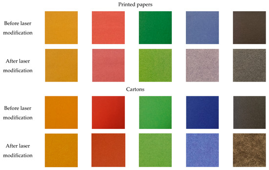 Photographs of paper and carton coloured samples before and after laser modification (12 W). All photos were taken with a Canon EOS 50D digital camera under D65 illuminance.