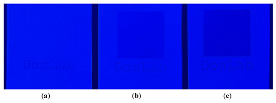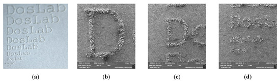 The above-presented results of the impact of laser processing on the properties of papers of different grammages and colours can find many practical applications. Figure 10 shows an example of using a pulsed laser to mark paper with microprints. The text “DosLab” of various sizes was laser engraved on the surface of the paper (Figure 10a) and visualized with an SEM microscope (Figure 10b–d). The size of the letters was measured in the VEGATG software and recalculated into the font size. The smallest letter that could be read under the microscope was 1.1 mm (Figure 10d, upper inscription), which corresponds to a font size of 3 pt. (1 pt. = 1/72 inch). These types of prints can be used as security for documents.