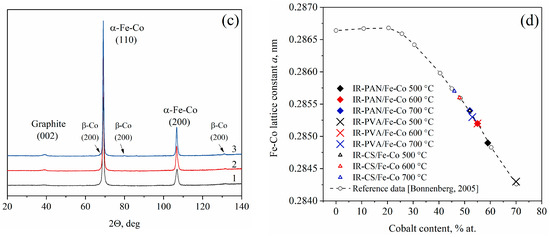Moreover, additional peaks in the XRD pattern of the sample IR-PVA/Fe-Co 500 °C (Figure 2b), which corresponded to magnetite, were observed. Therefore, a temperature of 500 °C is not sufficient for the complete reduction of metal oxides in nanocomposites based on PVA. The increase in intensity and the narrowing of the Fe-Co diffraction peaks within the range of PAN-, PVA- and CS-employing polymers was observed. This finding can be interpreted as both an increase in the volume fraction of the metal phase relative to the carbon support and an increase in the size of the Fe-Co particles.