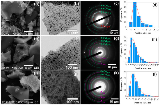 SEM and TEM images, SAED patterns and particle size distributions of IR-CS/Fe-Co nanocomposites synthesized at 500 °C (a–d), 600 °C (e–h) and 700 °C (i–l).