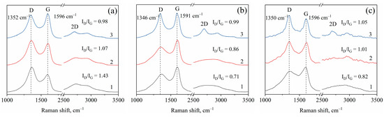 Raman spectra of IR-PAN/Fe-Co (a), IR-PVA/Fe-Co (b) and IR-CS/Fe-Co (c) nanocomposites synthesized at 500 °C (1), 600 °C (2) and 700 °C (3).
