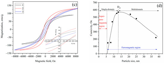It should be noted that, in this study, we operated with the average nanoparticle size. Increasing the synthesis temperature of nanocomposites results in both a broadening of the particle size distribution and an increase in the average size, impacting the coercive force and saturation magnetization values. Moreover, a nanocomposite may contain a significant fraction of the superparamagnetic phase, alongside the ferromagnetic phase. This hypothesis is further supported by the low residual magnetization value.