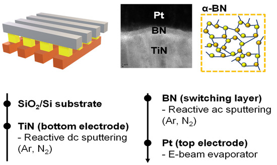 The transmission electron microscopy image and process flow of the Pt/BN/TiN device are shown in Figure 1. The bottom electrode comprised a TiN layer (thickness = 100 nm) deposited on a SiO2/Si substrate using a reactive sputtering method with a Ti target. During sputtering at room temperature, the Ar flow rate was 19 sccm, N2 flow rate was 1 sccm, and the working pressure was 3 mTorr. Subsequently, a BN target was sputtered for a 7 nm BN switching layer. The Ar flow rate was 20 sccm, N2 flow rate was 1 sccm, and the working pressure was 3 mTorr. Finally, to deposit the top electrode, Pt 100 nm was grown by e-beam evaporation. All the cells of Pt/BN/TiN were separated using photolithography and a lift-off process. Keithley’s 4200-SCS and 4225-PMU semiconductor parameter modules were respectively used for direct current (DC) sweep and pulse switching to investigate the electrical properties.