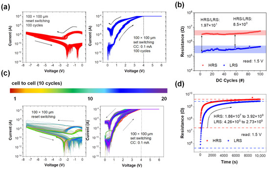 (a) One hundred direct current (DC) switching cycles of operation in the Pt/BN/TiN RRAM cell. (b) Representative endurance properties of RRAM devices based on the DC operation method. (c) Twenty DC cell−to−cell switching cycles of RRAM cells. (d) Retention properties of RRAM devices.
