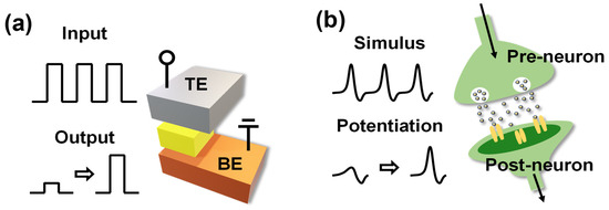The recent advances in the Internet of Things (IoT) and artificial intelligence (AI) have led to increased information influx, thus necessitating higher-performing processors, minimal power consumption, and increased computation speeds [1,2]. However, conventional computing systems, based on the von Neumann architectural design have bottlenecks attributed to their serial data processing structures [3,4,5]. In response to this challenge, a recent study proposed an alternative architecture to that used in von Neumann systems [6,7]. A neuromorphic system features parallel networks comprised of neurons and synapses. It performs complex tasks, such as pattern recognition, very efficiently because the processor and memory are closer within a single semiconductor chip compared with their arrangement in the traditional computing system [8].